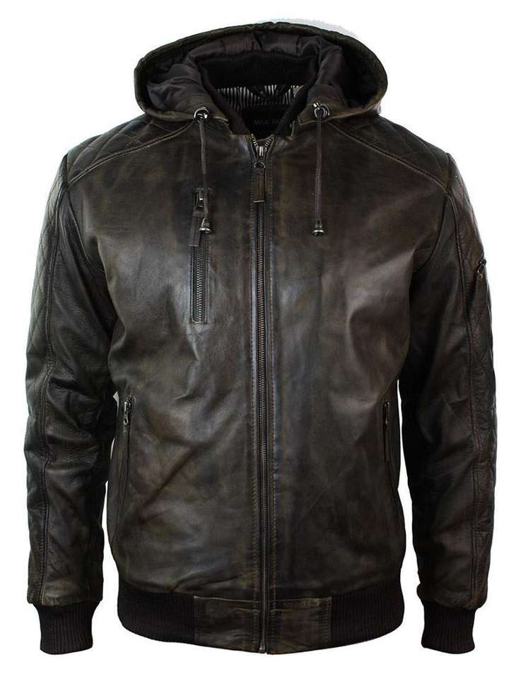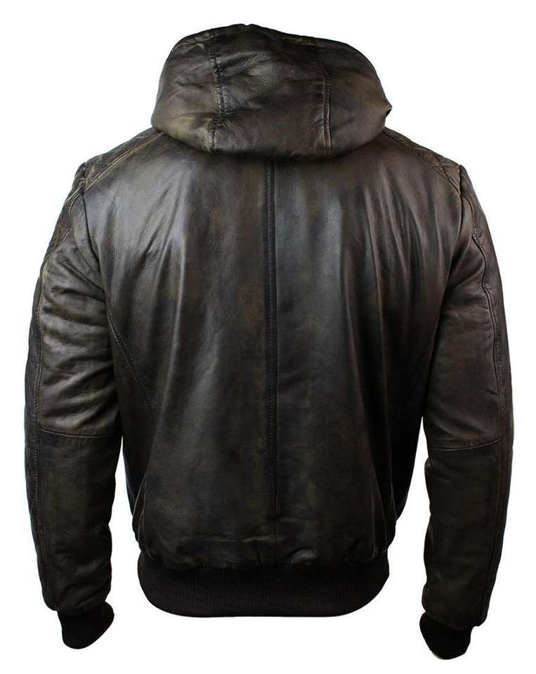 เสื้อแจ็คเก็ตหนังผู้ชายแบบมีฮู้ด หนังแท้ สวมใส่สบาย สไตล์ลำลอง ทรงบอมเบอร์ ทรงพอดีตัว แฟชั่นไบค์เกอร์ ราคาขายส่ง
