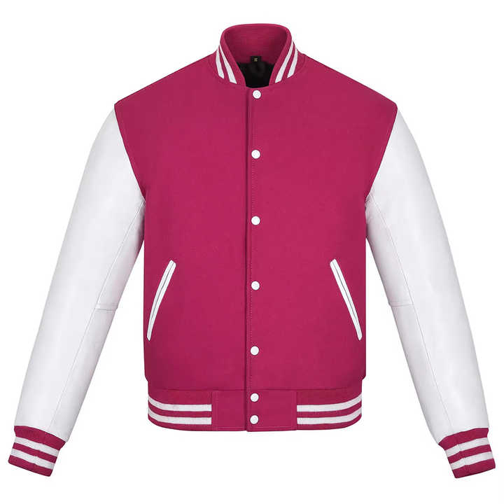 เสื้อแจ็คเก็ตผู้ชายสีชมพูและสีขาว สไตล์วาร์ซิตี้คลาสสิกแบบเบสบอล แขนเสื้อตัดสี ให้ความอบอุ่น สวมใส่สบาย เหมาะสำหรับใส่ลำลอง