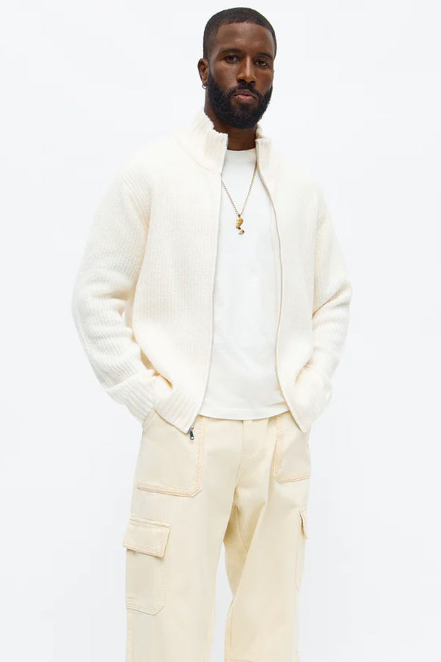 เสื้อสเวตเตอร์ถักไหมพรมผู้ชาย 100% ขนสัตว์แท้ ทรงหลวม สวมใส่สบาย มีซิป ผลิตโดย Antique Fashion