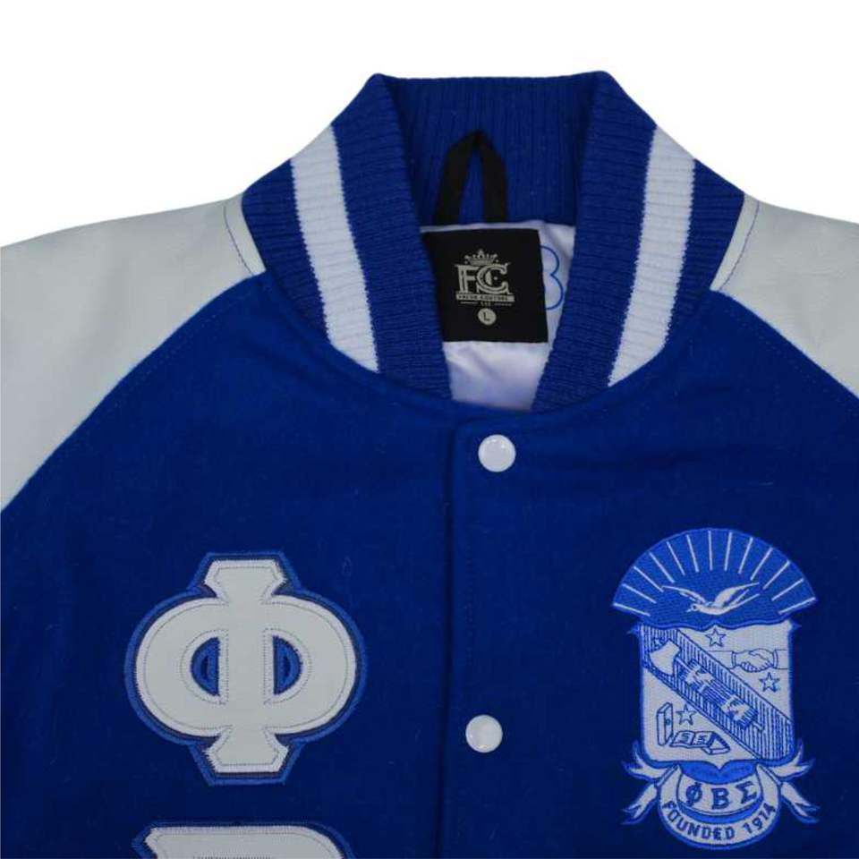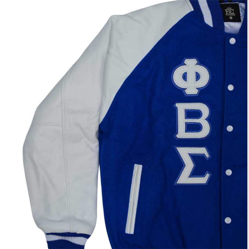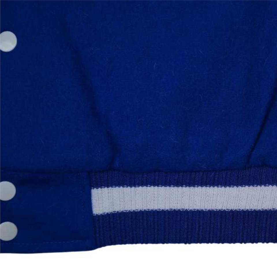 แจ็กเก็ตเลตเตอร์แมนสำหรับผู้ชายผ้าขนสัตว์แคชเมียร์สีน้ำเงินและแขนเสื้อหนังแท้สีขาวเสื้อผ้าเครื่องแต่งกายแบบชาวกรีก