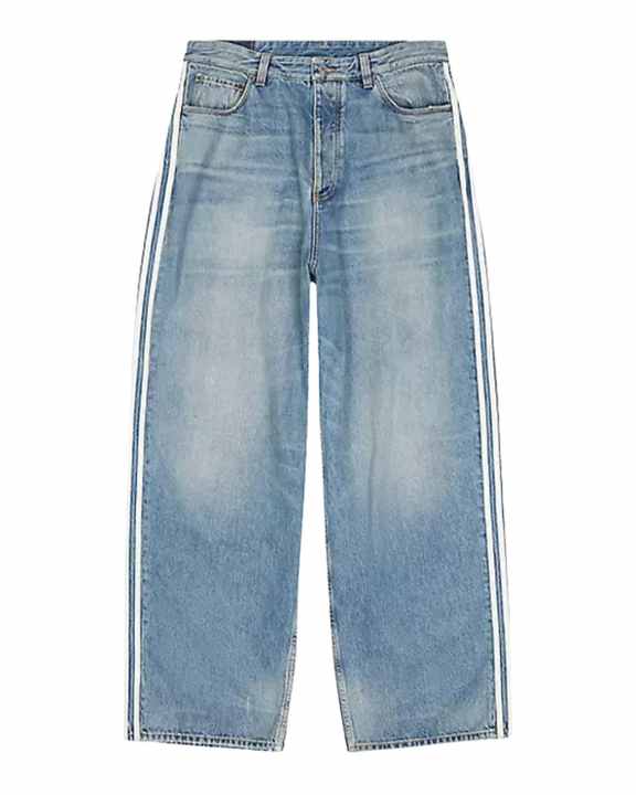 กางเกงยีนส์ผู้ชายสีฟ้าอ่อน ทรงขากว้าง แต่งแถบข้าง สไตล์ลำลอง สตรีทแวร์ ลุควินเทจ ผ้าฝ้าย ซักแบบวินเทจ สำหรับผู้ชาย แฟชั่นใส่ได้ทุกวัน