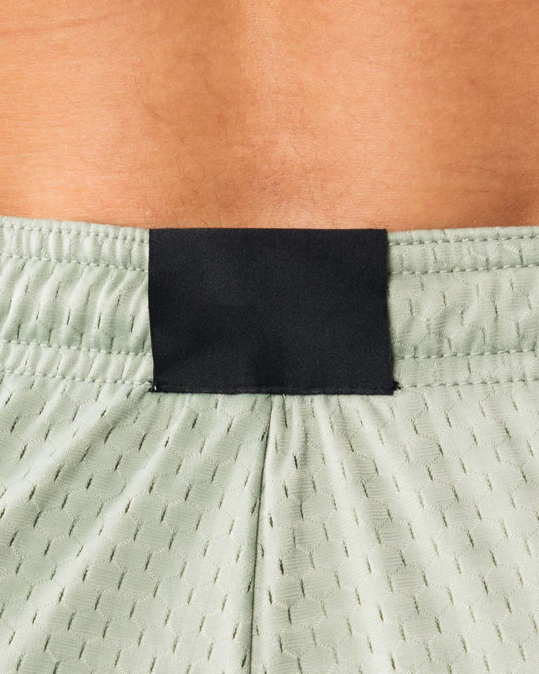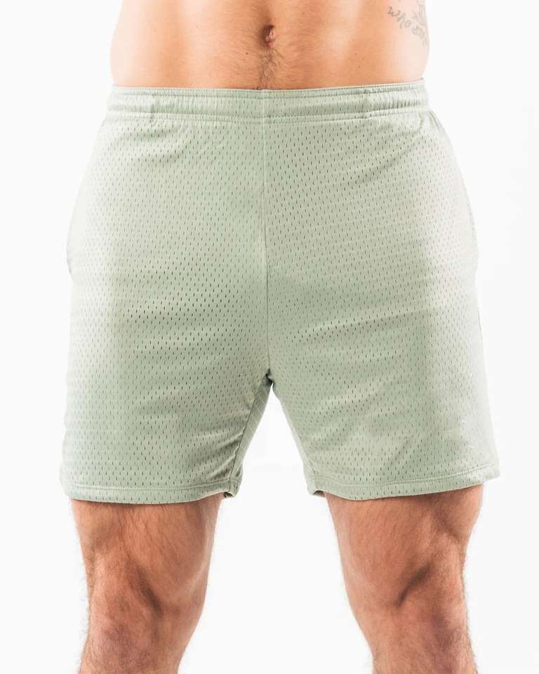 กางเกงขาสั้นกีฬาผู้ชายสีเขียวอ่อน ผ้าตาข่าย ระบายอากาศ แห้งเร็ว เหมาะสำหรับออกกำลังกาย วิ่ง และเล่นกีฬา ผลิตจากโพลีเอสเตอร์ 100%