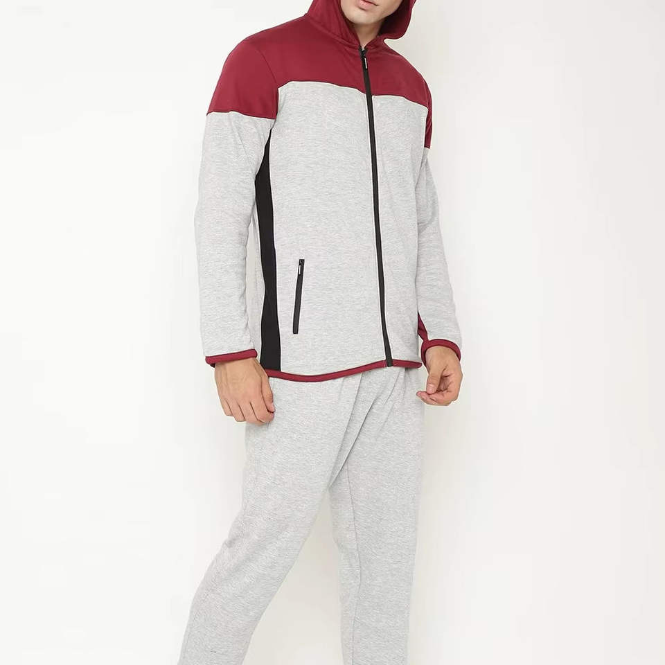 ชุดวอร์มผู้ชายสีเทาอ่อนแดง แบบเป็นมิตรต่อสิ่งแวดล้อม ระบายอากาศได้ดี ประกอบด้วยเสื้อแจ็คเก็ตแบบซิปเต็มตัว กางเกงจ็อกเกอร์ทรงเข้ารูป เหมาะสำหรับการฝึกซ้อมกีฬา