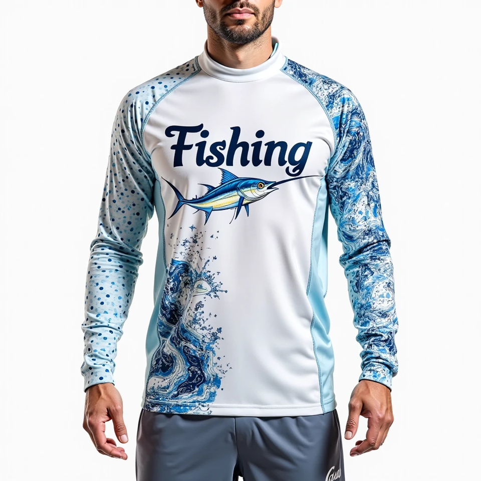 เสื้อตกปลาแขนยาวของผู้ชายผ้า100% โพลีเอสเตอร์ระบายอากาศได้ดีผ้าซับลิเมชันแบบปรับแต่งได้ทั้งหมดป้องกันแสงแดดได้
