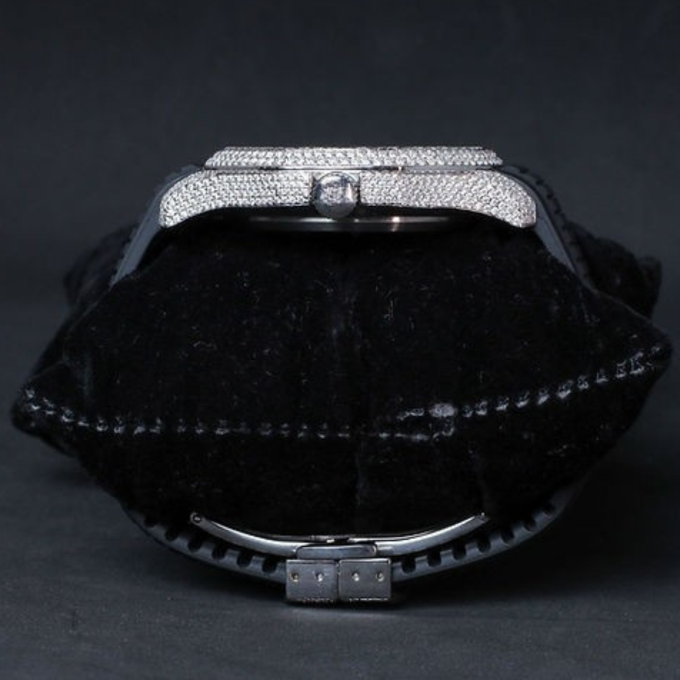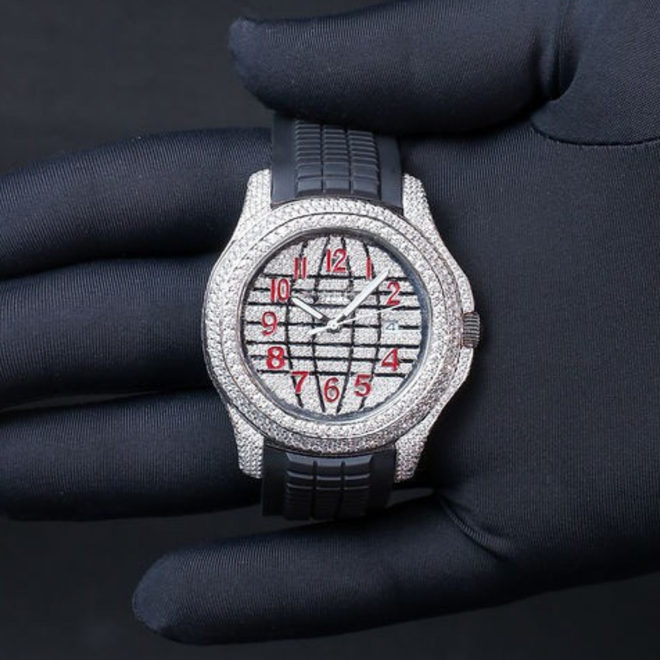 นาฬิกาบุรุษสุดหรูหน้าปัดตัวเลขสีแดงประดับเพชรแบบเต็มขอบสายยางนาฬิกาแฟชั่นฮิปฮอปนาฬิกาข้อมือควอทซ์เครื่องประดับ