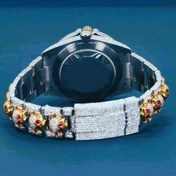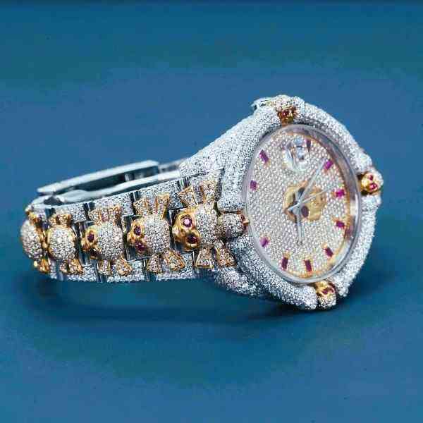 นาฬิกาประดับเพชรดีไซน์รูปหัวกะโหลกสำหรับผู้ชายนาฬิกาข้อมือสแตนเลสสีเงินสไตล์ฮิปฮอปสีทองแบบสองสีสุดหรู