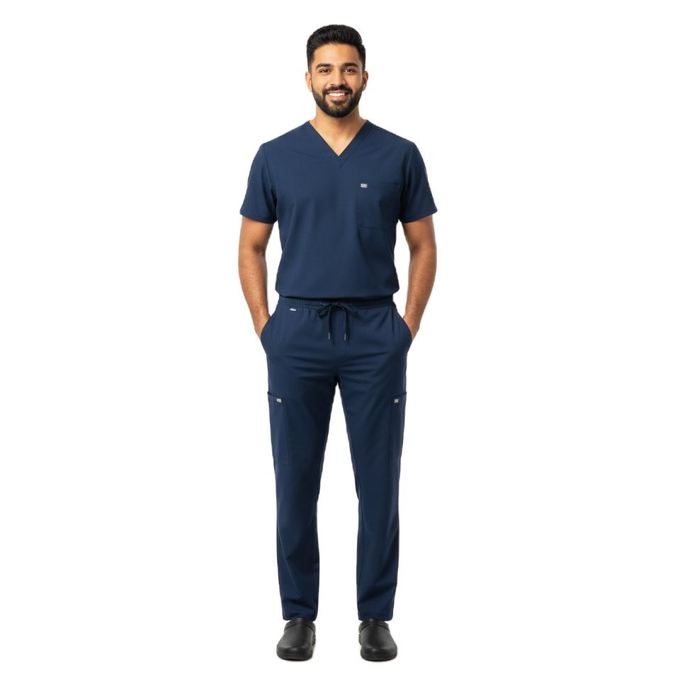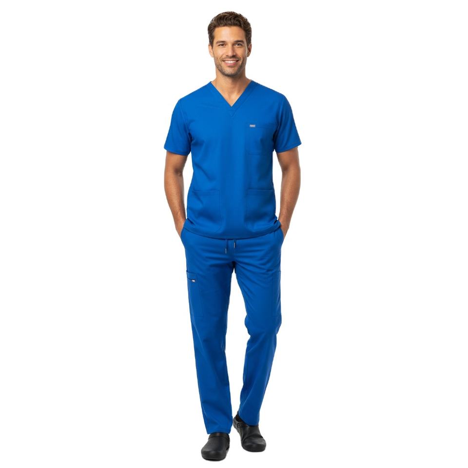 ชุดสครับผู้ชายแบบทันสมัย ปรับแต่งได้ เนื้อผ้านุ่ม ทนทาน เสื้อคอวีและกางเกง ชุดยูนิฟอร์มสำหรับคลินิกและโรงพยาบาล คุณภาพเชื่อถือได้ ขายส่ง