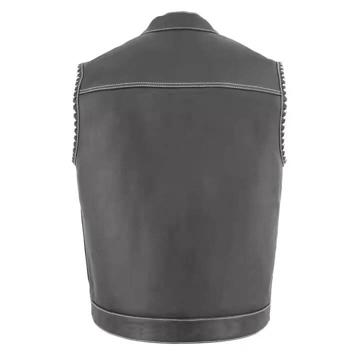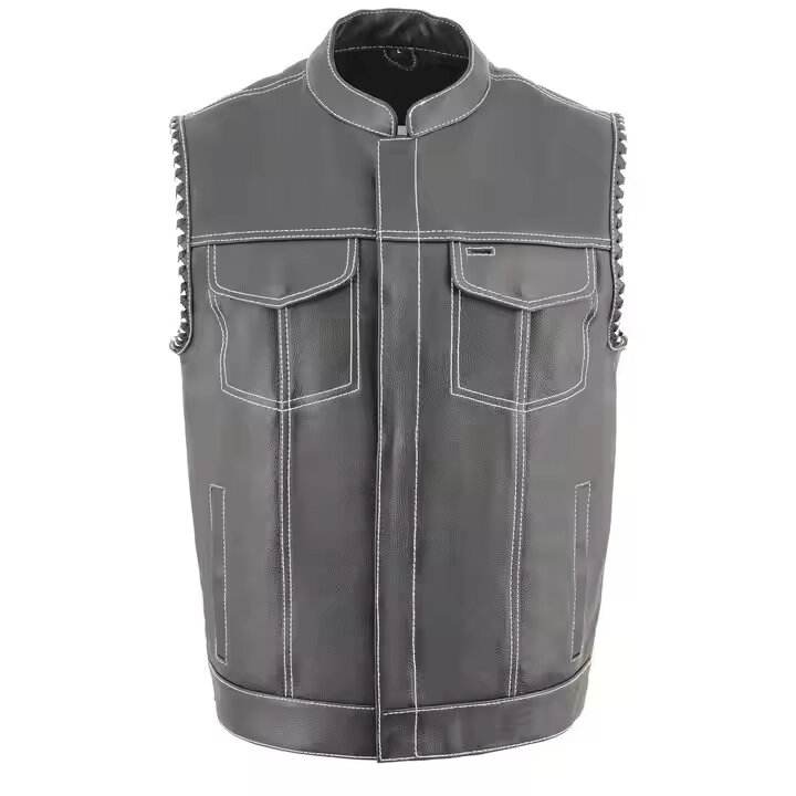 เสื้อกั๊กหนังวัวเปลือยสำหรับนักขี่รถจักรยานยนต์ผู้ชายมีซิปคอตั้งเสื้อกั๊กผลิตจากโรงงาน