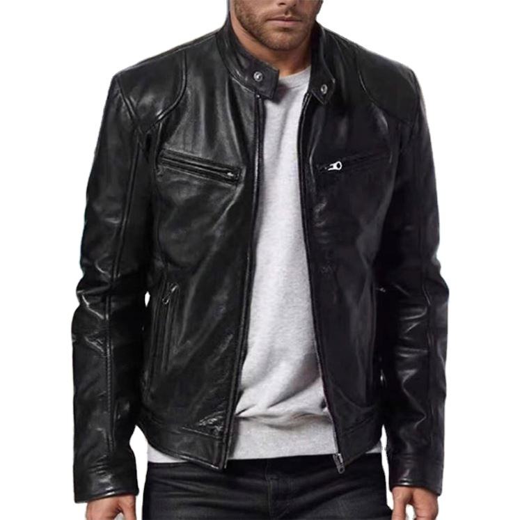 เสื้อแจ็คเก็ตมอเตอร์ไซค์ผู้ชาย หนัง PU สไตล์ลำลอง ทรงเข้ารูป ปกปกติ ซิปหน้า กันลม ใส่ได้ในฤดูหนาว เป็นมิตรกับสิ่งแวดล้อม มีโลโก้ด้านหน้า