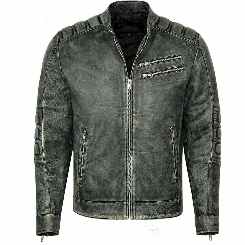 เสื้อแจ็กเก็ตมอเตอร์ไซค์ของผู้ชาย,เสื้อนักแข่งหนังแท้สีดำลายวินเทจ