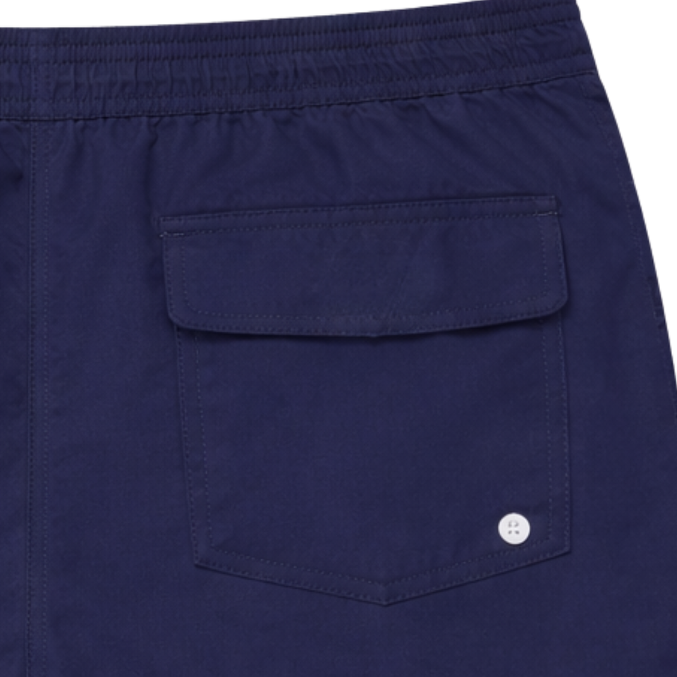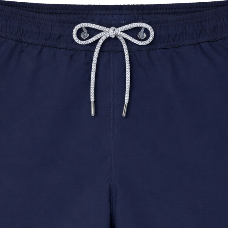 กางเกงขาสั้นว่ายน้ำลำลองสีน้ำเงินกรมท่าสำหรับผู้ชาย แห้งเร็ว น้ำหนักเบา เป็นมิตรกับสิ่งแวดล้อม ชุดชายหาด เอวยางยืด มีเชือกผูก กระเป๋าข้าง สำหรับฤดูร้อน