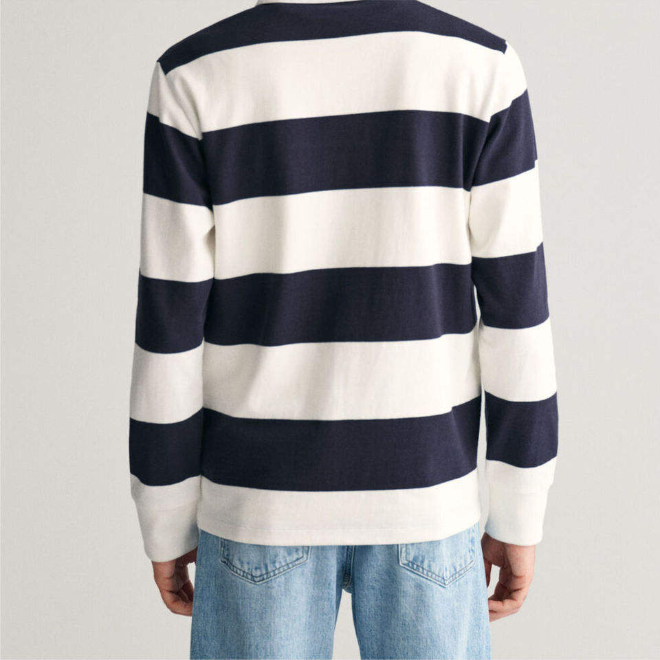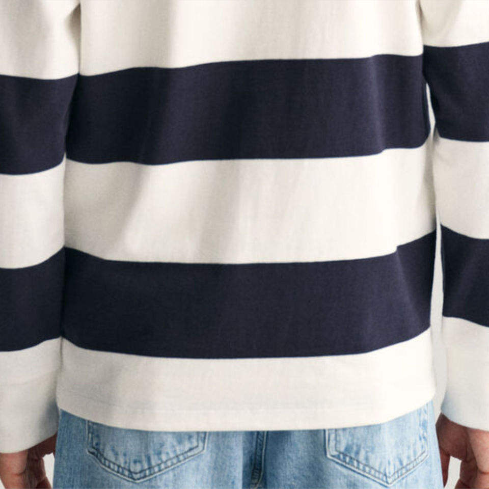 เสื้อโปโลรักบี้ลายทางสีกรมท่าและสีขาวสำหรับผู้ชาย แขนยาว ทรงปกติ ผ้าคอตตอนผสม แฟชั่นทันสมัย เสื้อผ้าผู้ชาย นุ่มสบาย