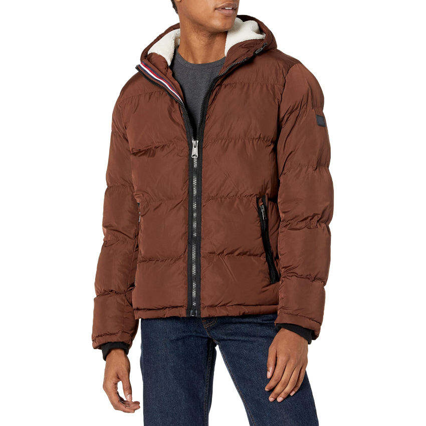 เสื้อแจ็คเก็ตพัฟเฟอร์ผู้ชายสำหรับฤดูหนาว สไตล์ลำลอง คอตั้ง โลโก้ด้านหน้า ผ้าแคนวาสหนา รับผลิตตามสั่ง ขายส่ง