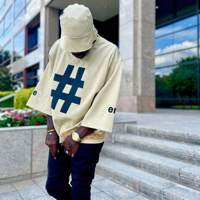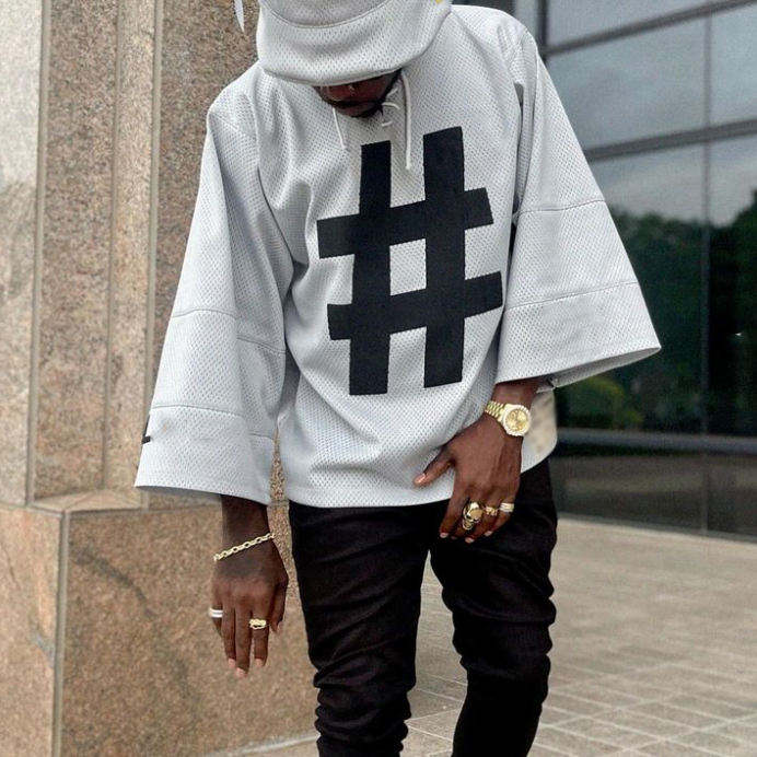 เสื้อยืดสตรีทแวร์ผู้ชายทรงโอเวอร์ไซส์ แขนกว้าง แฟชั่นฮิปฮอป พิมพ์ลายกราฟิกแฮชแท็ก ทรงหลวม สไตล์ลำลองในเมือง สีเบจ สีม่วง