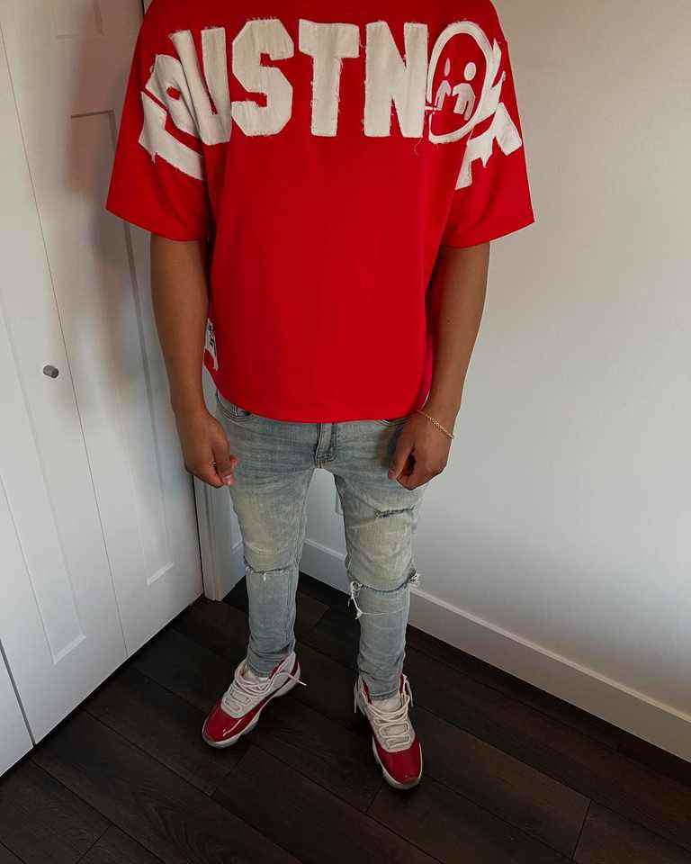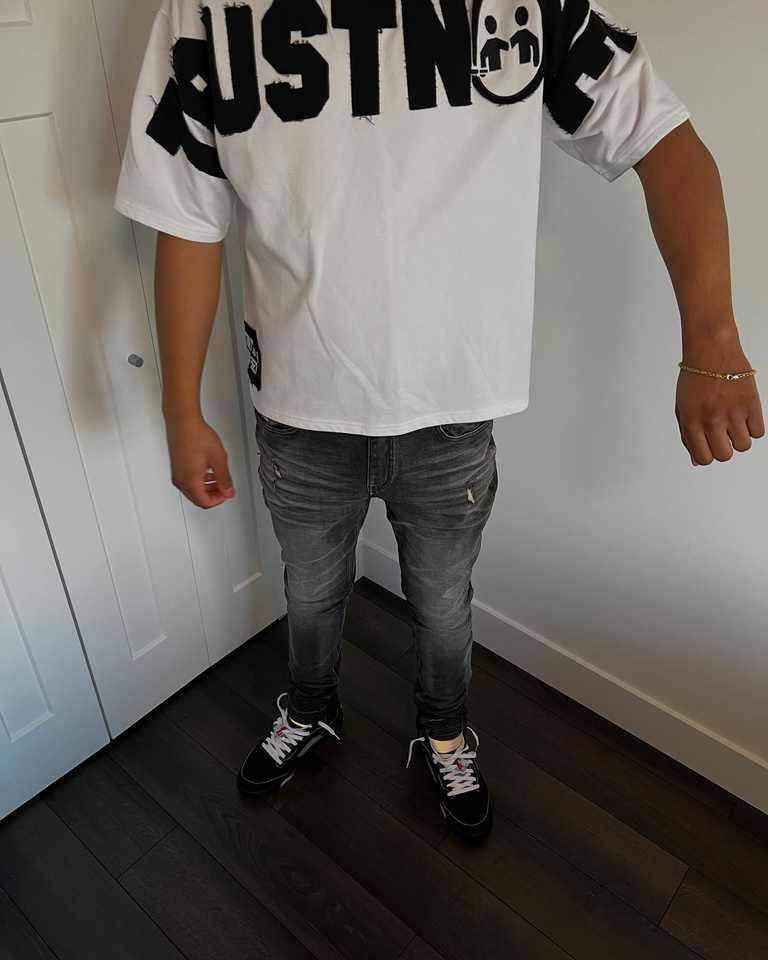 เสื้อยืดโอเวอร์ไซส์ผู้ชาย Trustnone พิมพ์ลายกราฟิก แขนสั้น คอกลม สตรีทแวร์ แฟชั่นลำลอง ฮิปฮอป เสื้อยืดผ้าฝ้าย สีแดง