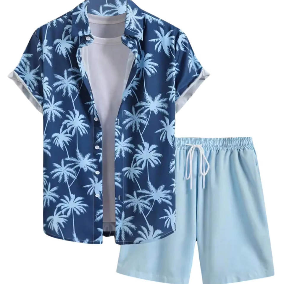 ชุดลำลองผู้ชายแบบถักเนื้อผ้าเรียบสำหรับฤดูร้อน ชุดสองชิ้น เสื้อเชิ้ตแขนสั้นติดกระดุมและกางเกงขาสั้นเอวยางยืด ชุดชายหาดน้ำหนักเบา
