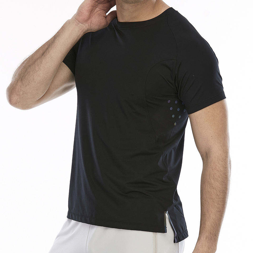 เสื้อยืดออกกำลังกายผู้ชาย สีดำ แขนสั้น คอกลม ระบายเหงื่อได้ดี มีช่องด้านข้าง เหมาะสำหรับออกกำลังกายในยิม