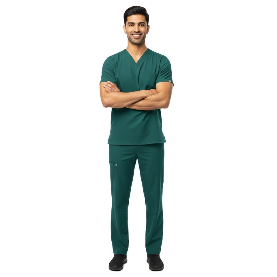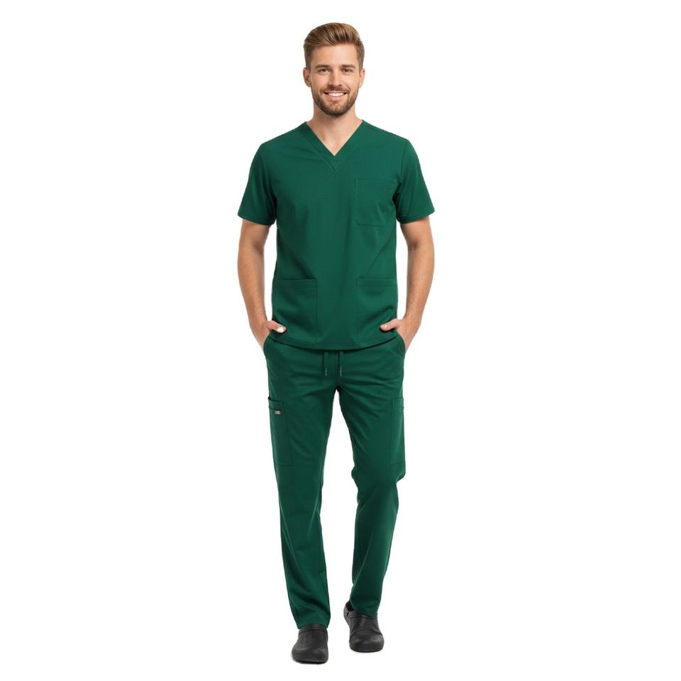 ชุดสครับผู้ชายแบบพอดีตัว ปรับแต่งได้ พรีเมียม ทนทาน เสื้อคอวีและกางเกง ชุดยูนิฟอร์มสำหรับคลินิกและโรงพยาบาล ระดับมืออาชีพ