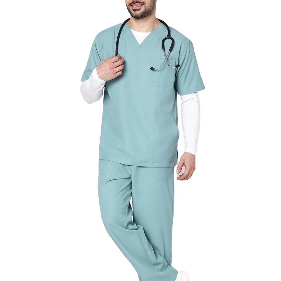 ชุดสครับแพทย์ผู้ชายระดับพรีเมียม ปรับแต่งได้ ทนทาน สวมใส่สบาย เสื้อคอวีและกางเกง ชุดยูนิฟอร์มคลินิกโรงพยาบาล คุณภาพระดับมืออาชีพ