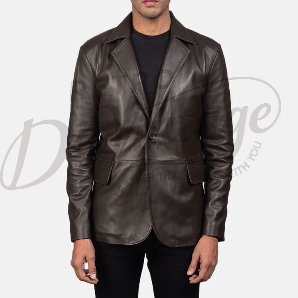 เสื้อเบลเซอร์หนังแท้สีน้ำตาลเข้มพรีเมียมสำหรับผู้ชาย ทรงเข้ารูป กระดุมสองเม็ด สไตล์ลำลอง มีกระเป๋าปะ