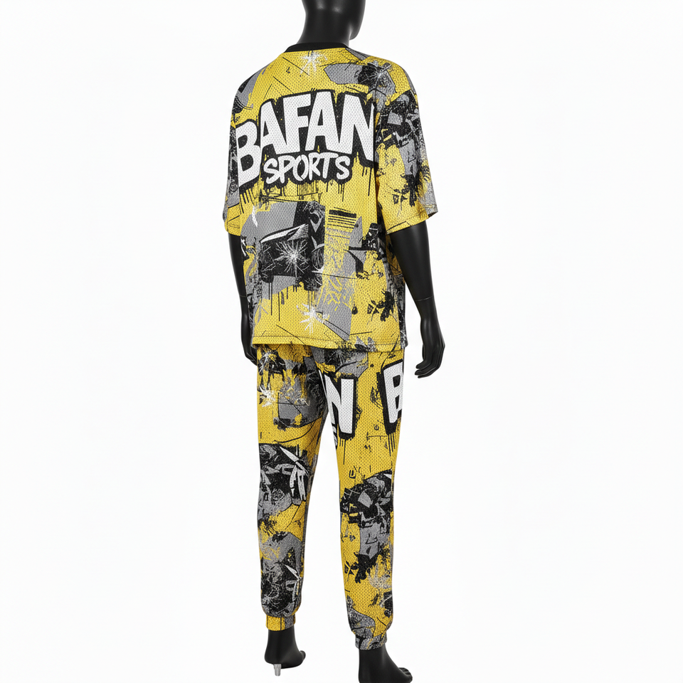 ชุดเสื้อและกางเกงผู้ชาย พรีเมียม โพลีเอสเตอร์ ตาข่าย ระบายอากาศ 180 GSM สีเหลืองดำ ดีไซน์แผงสี แบบสั่งทำพิเศษ ชุด 2 ชิ้น