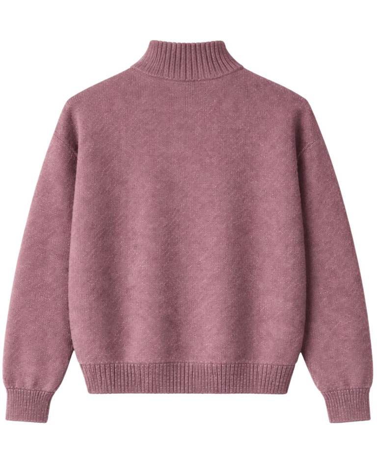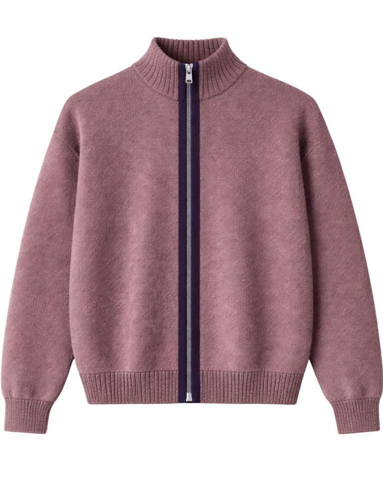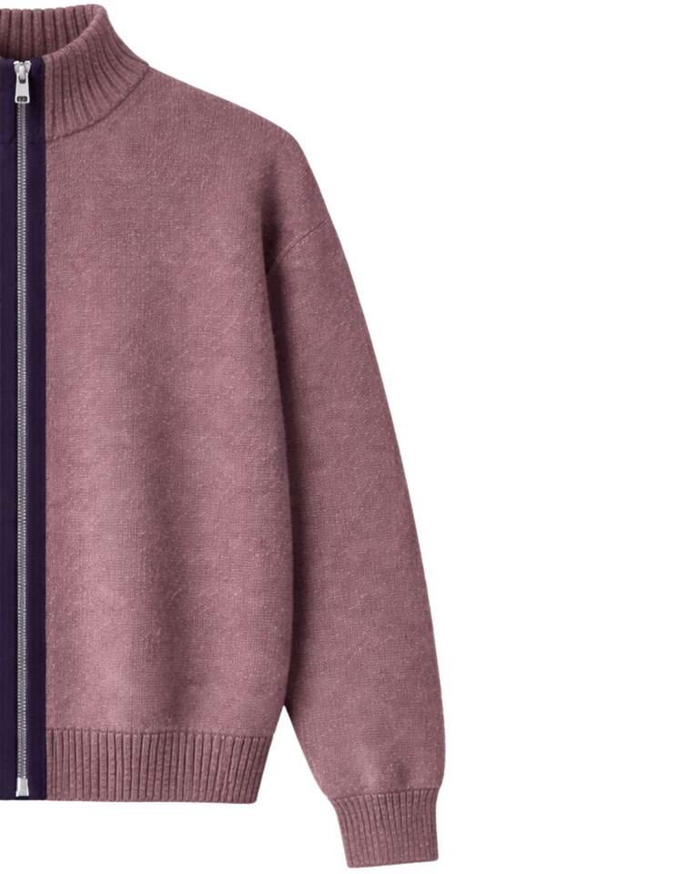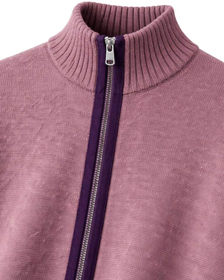 เสื้อแจ็คเก็ตไหมพรมถักแบบซิปสำหรับผู้ชาย สีม่วงอมม่วง คอสูง เสื้อคลุมฤดูหนาวแบบซิปเต็มตัว ผู้ผลิต OEM ขายส่งสำหรับผู้ชาย