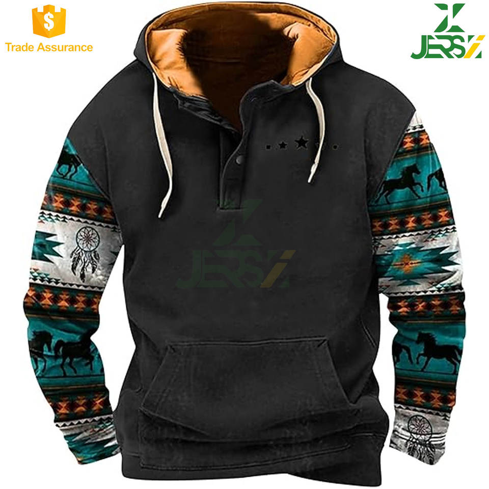 เสื้อฮู้ดแขนยาวสำหรับผู้ชายพิมพ์ลายโพลีเอสเตอร์/ ผ้าฝ้ายแบบสวมหัวแนววินเทจแบบลำลองมีกระเป๋ามีสไตล์