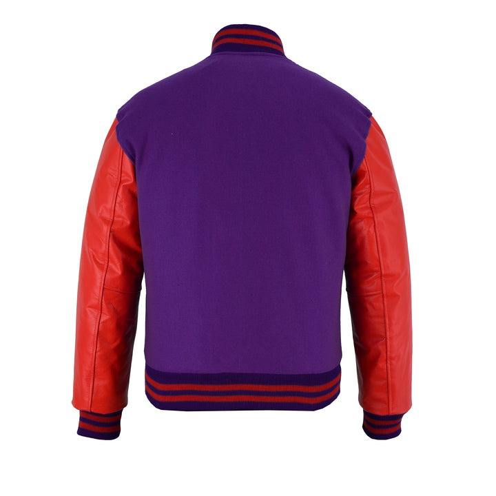 เสื้อแจ็คเก็ตบอมเบอร์สีม่วงสำหรับผู้ชาย แขนหนังสีแดง โลโก้สั่งทำ ชุดทีมสตรีทแวร์ เสื้อคลุมกันหนาว กันน้ำ เป็นมิตรกับสิ่งแวดล้อม หนา