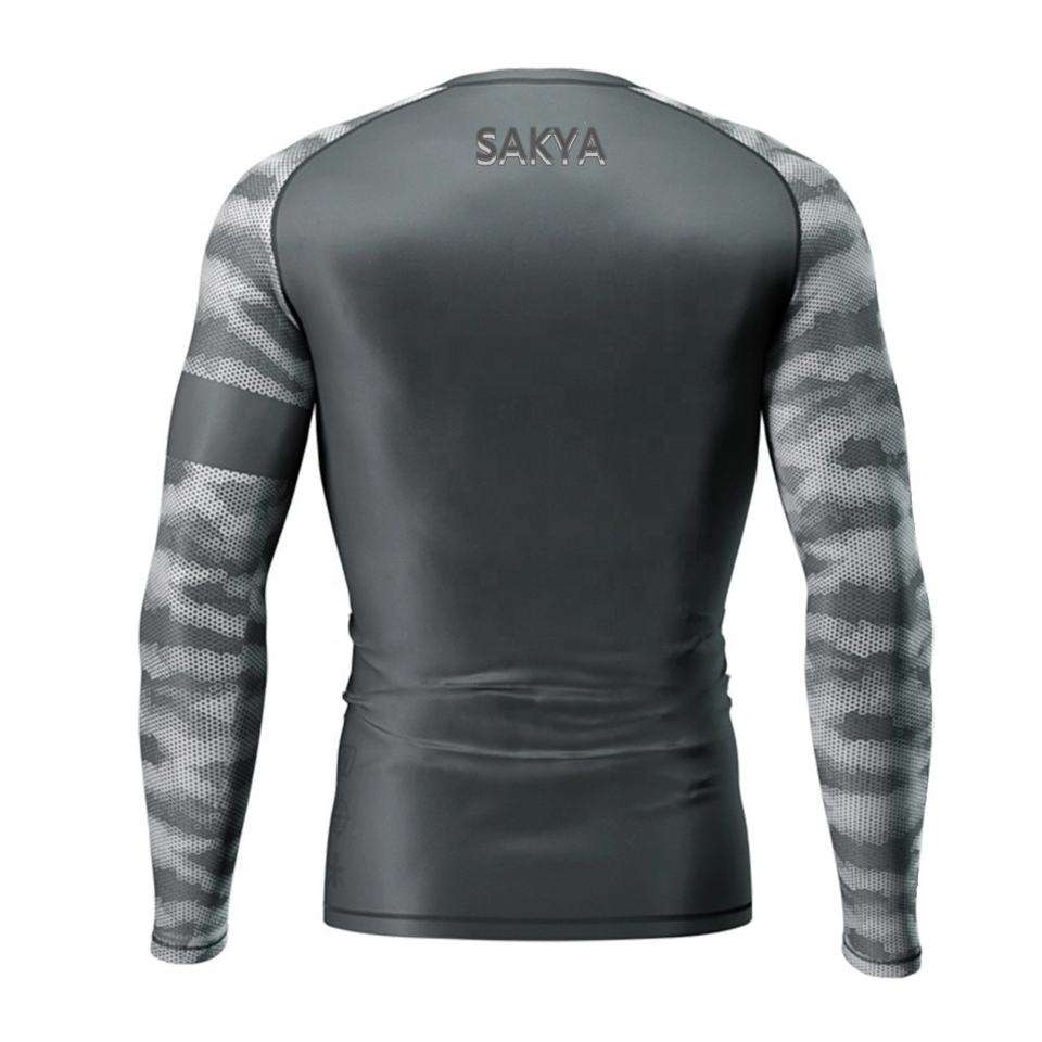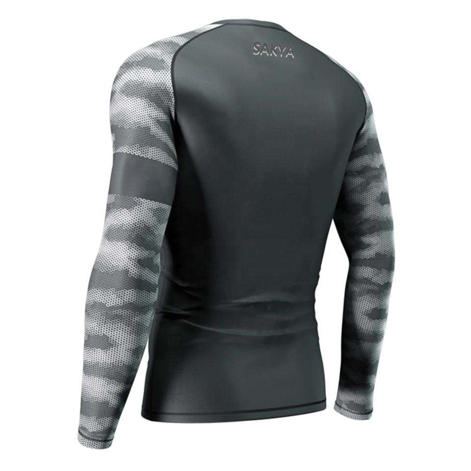 เสื้อรัดกล้ามเนื้อแขนยาวสำหรับผู้ชาย สีเทาชาร์โคล ลายพรางที่แขนเสื้อ เหมาะสำหรับการฝึกซ้อมกีฬาและการออกกำลังกาย
