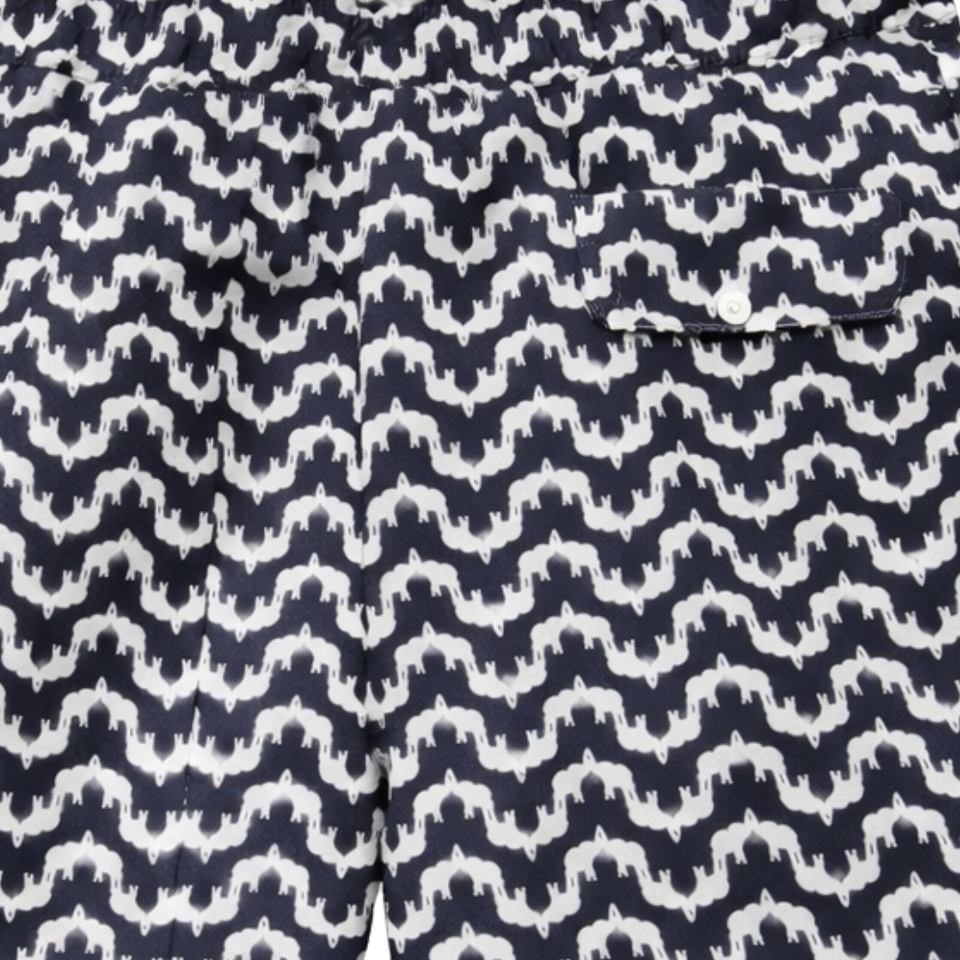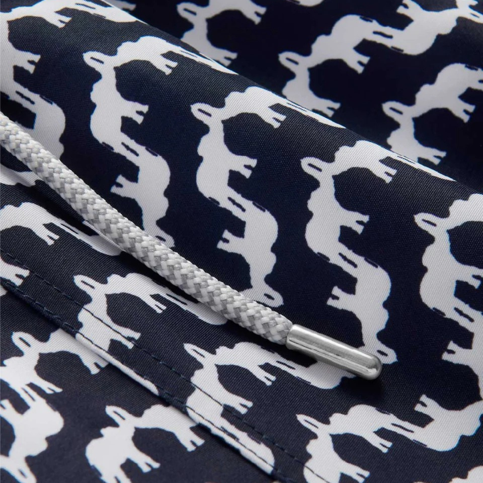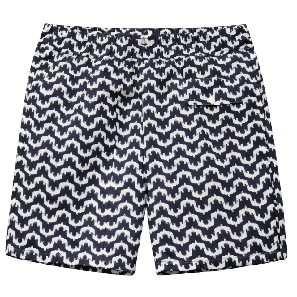 กางเกงว่ายน้ำชายแบบรีไซเคิล ลายเรขาคณิตสีน้ำเงิน แห้งเร็ว สำหรับใส่ไปชายหาด มีเชือกผูกเอวและกระเป๋า