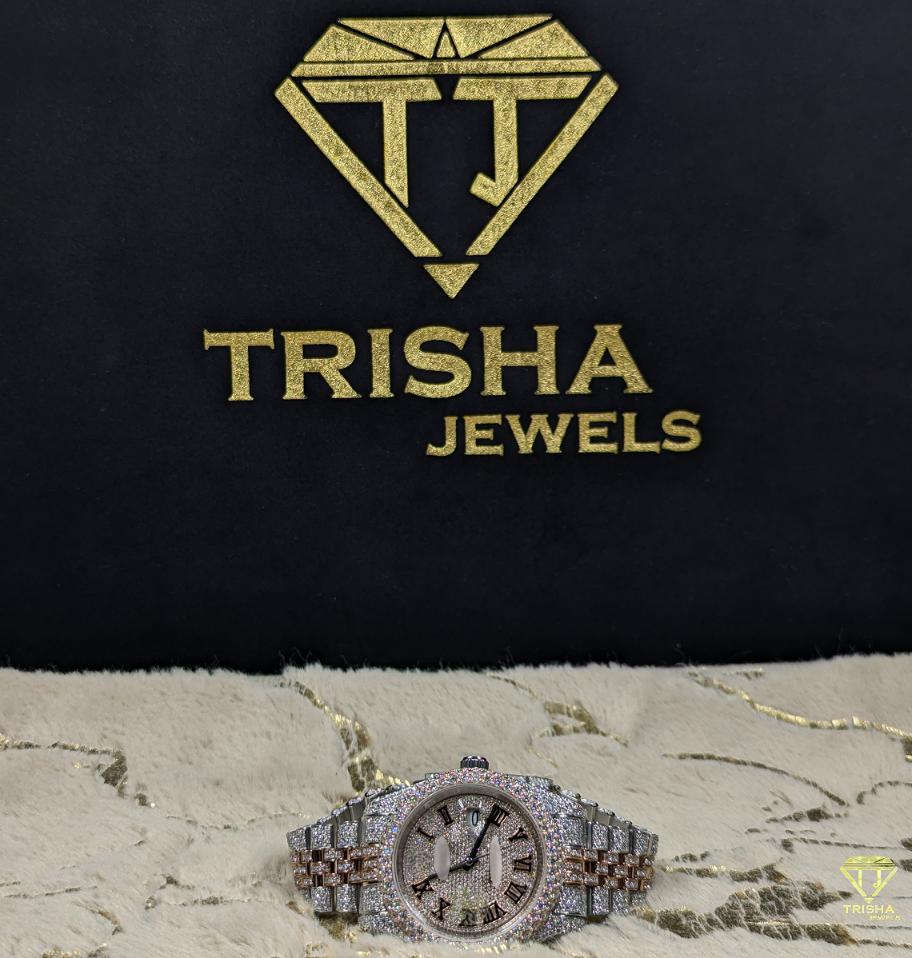 นาฬิกาเพชรเคลือบเงาสีโรสโกลด์สำหรับผู้ชายประกายแวววาวแวววาวสองโทนสีชิ้นอันโดดเด่น