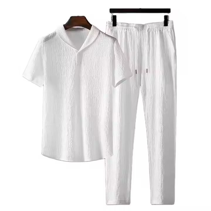 ชุดวอร์มลำลองถักแขนสั้นคอกลมสำหรับผู้ชายชุดสองชิ้นสำหรับฤดูร้อน