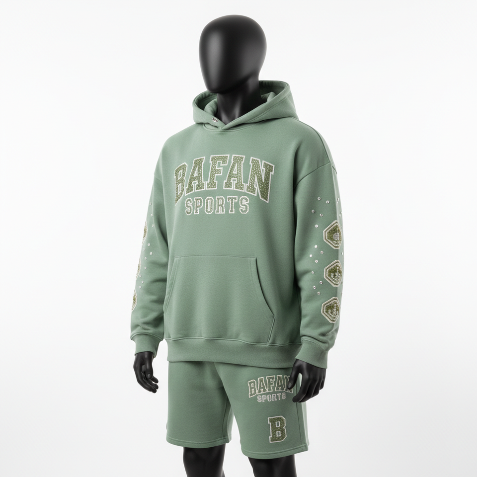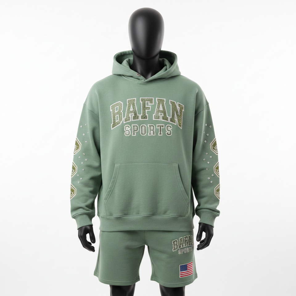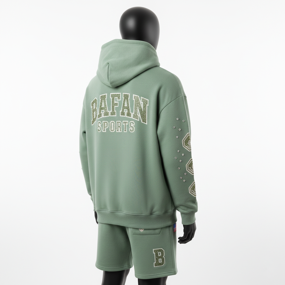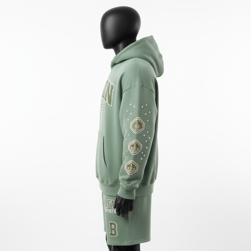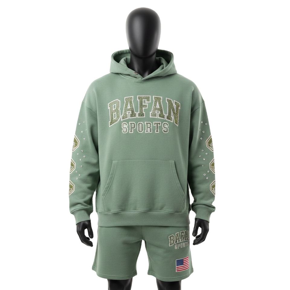 ชุดเซ็ตฮู้ดดี้และกางเกงขาสั้นผ้าฟลีซผสมคอตตอนโพลีเอสเตอร์ 340 GSM สีเขียวเซจสำหรับผู้ชาย พร้อมปักโลโก้ด้วยคริสตัลและงานพิมพ์ลายตามสั่ง