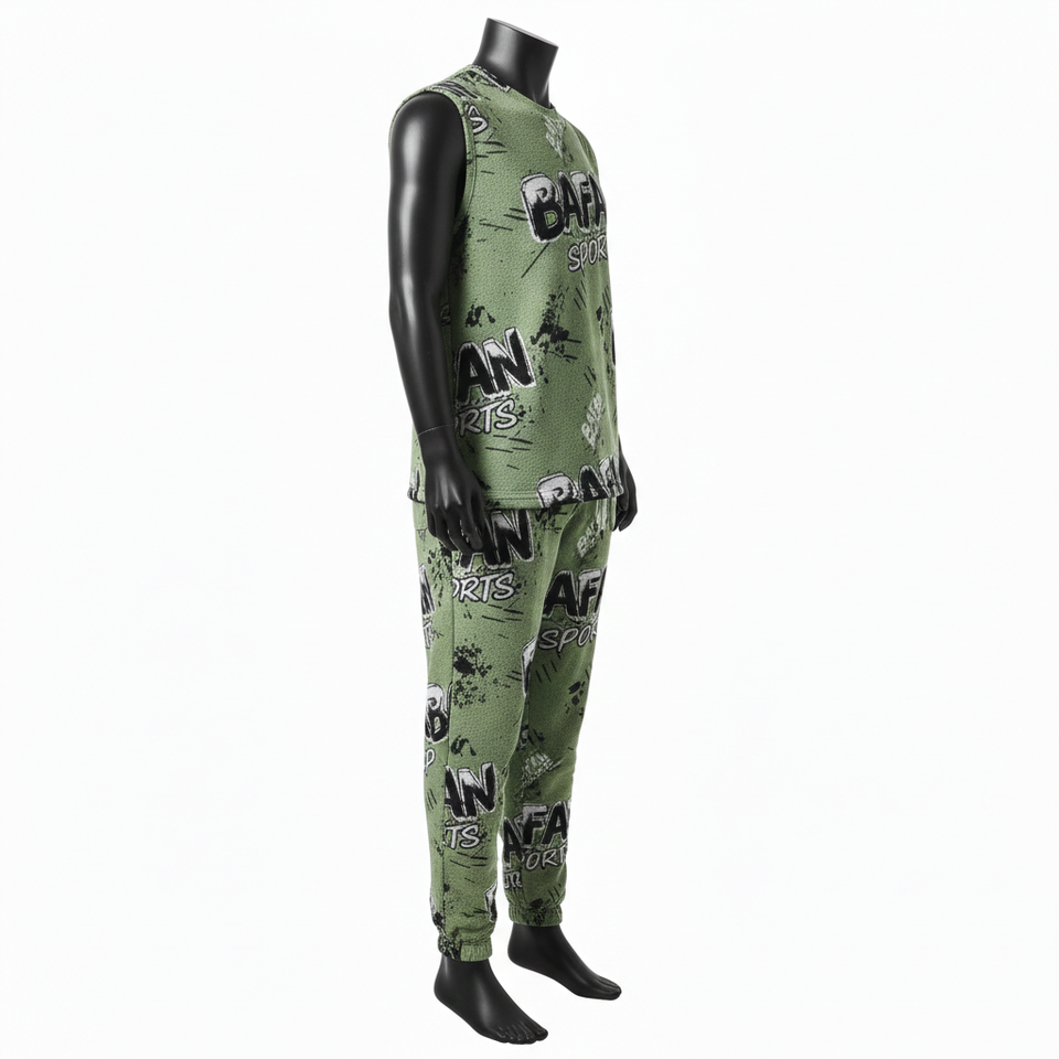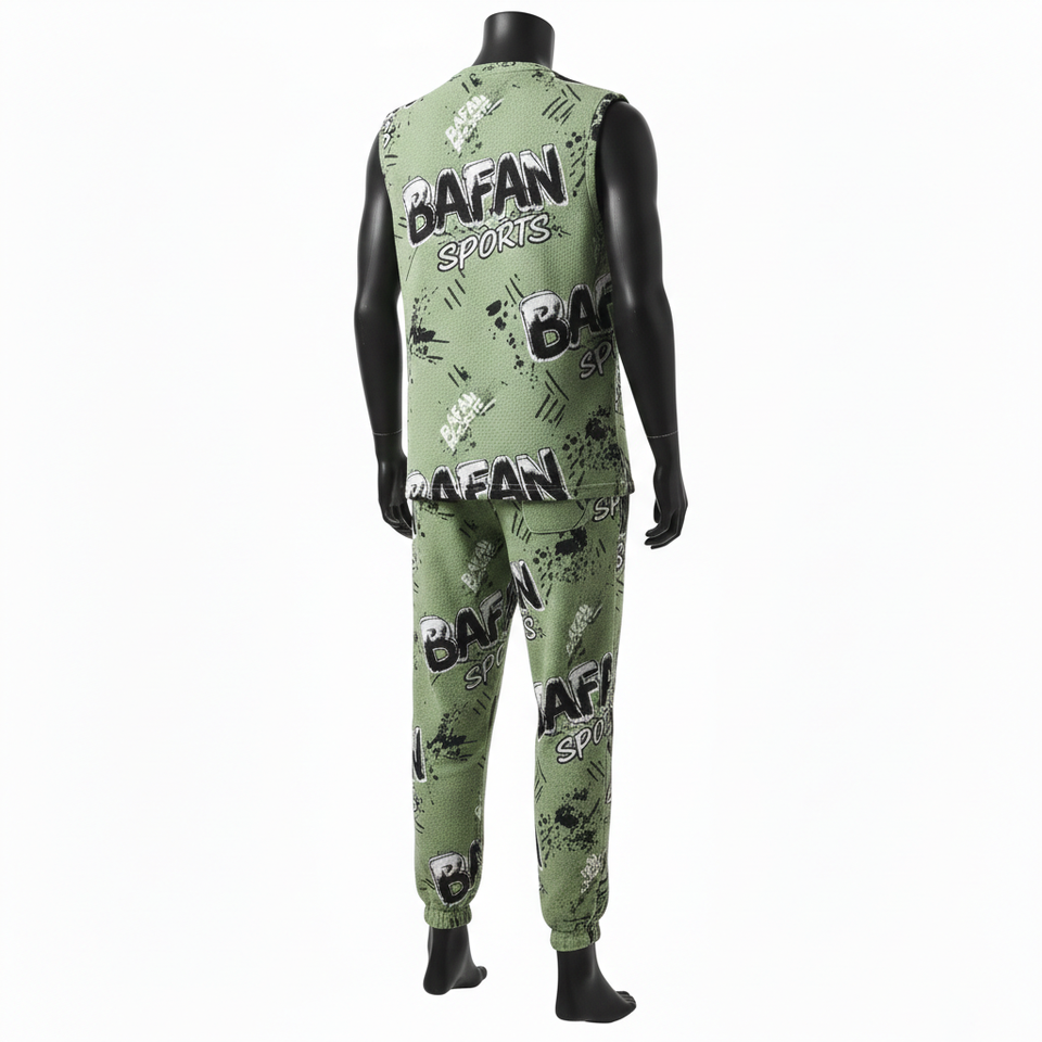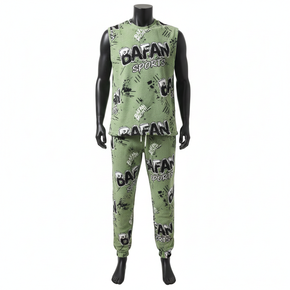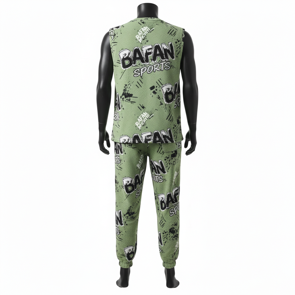 เสื้อยืดแขนกุดผู้ชาย กางเกงขายาว ผ้าโพลีเอสเตอร์ผสมสแปนเด็กซ์เนื้อตาข่าย 220GSM พรีเมียม สีเขียว ดำ ขาว พิมพ์โลโก้แบบซับลิเมชั่น ชุด 2 ชิ้น สำหรับผู้ชาย
