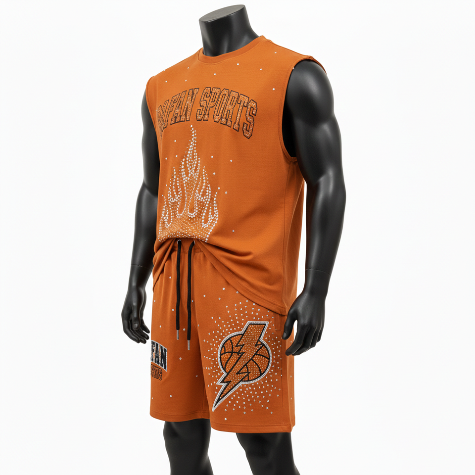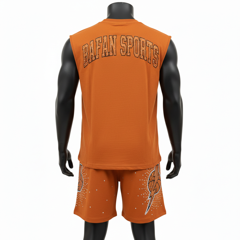 ชุดเสื้อกล้ามและกางเกงขาสั้นผู้ชาย ผ้าฝ้ายผสมโพลีเอสเตอร์เนื้อนุ่ม สีส้ม พิมพ์ลายกีฬา รับสกรีนโลโก้