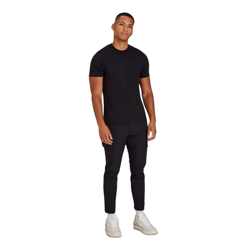 กางเกงคาร์โก้ผู้ชายทรงสลิมฟิตสีดำดีไซน์คล่องตัวเอวยางยืดและผ้ายืดน้ำหนักเบา