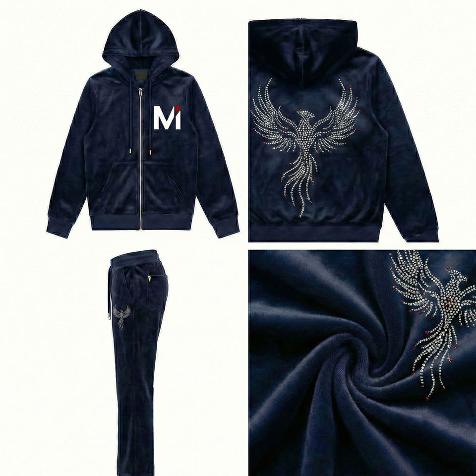 ชุดวอร์มกำมะหยี่พิมพ์ลายแบบสวมใส่ได้ทั้งชายและหญิง ทรงปกติ พร้อมซิปฮู้ดดี้และกางเกงจ็อกเกอร์ แฟชั่นหรูหรา สไตล์อเมริกาและยุโรป Maluza LuxeStreet