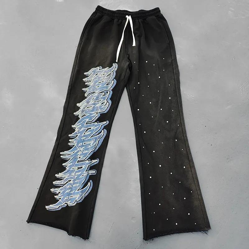 กางเกงวอร์มสำหรับผู้ชายกางเกงวิ่งทรงหลวมโอเวอร์ไซส์ผ้าคอตตอนชายเสื้อกางเกงซับเหงื่อพิมพ์ลายกราฟิกพลอยเทียมปลายบานสำหรับผู้ชาย