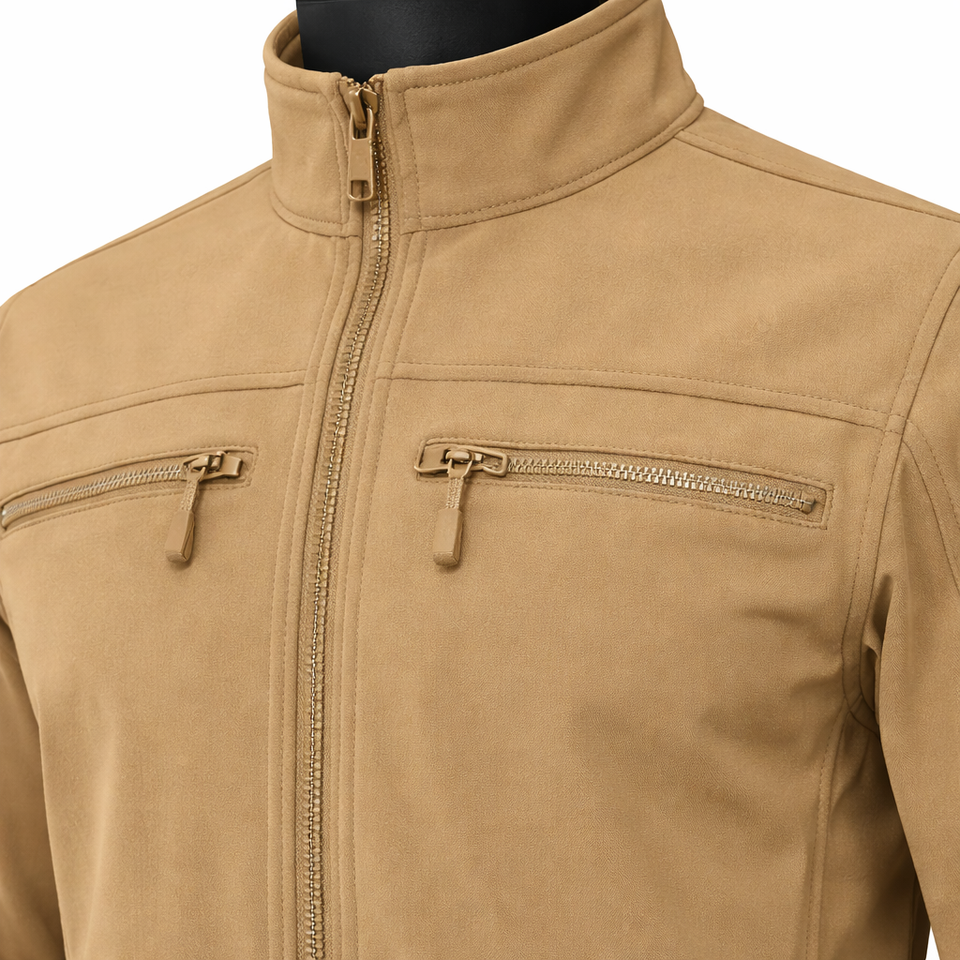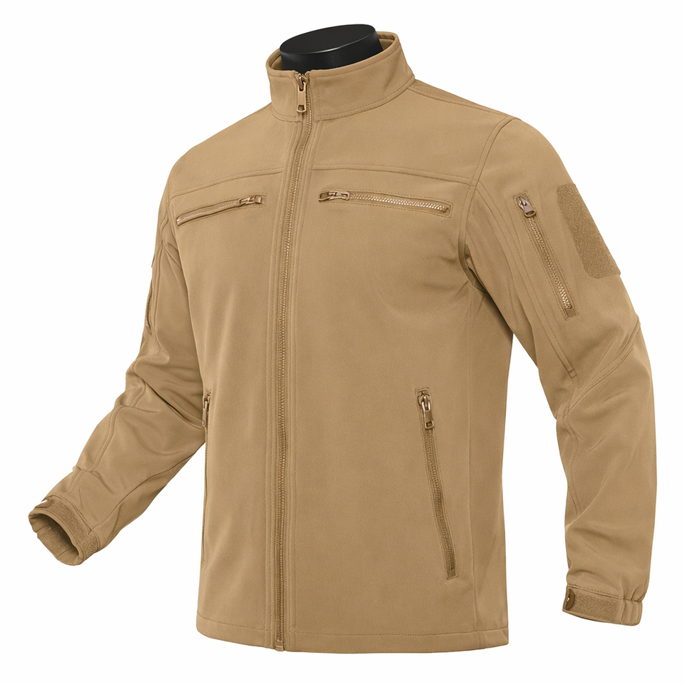 เสื้อแจ็คเก็ตซอฟต์เชลล์ผู้ชาย สีแทน ซิปเต็มตัว กันลม กันน้ำ เหมาะสำหรับงานกลางแจ้ง มีกระเป๋าหลายช่อง
