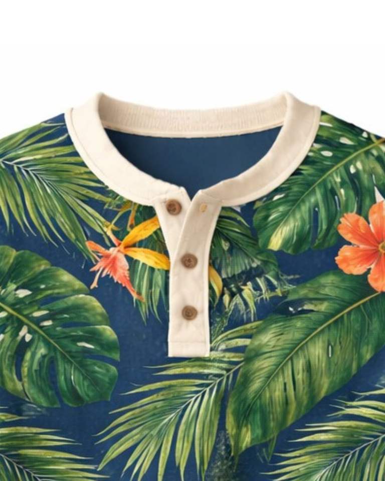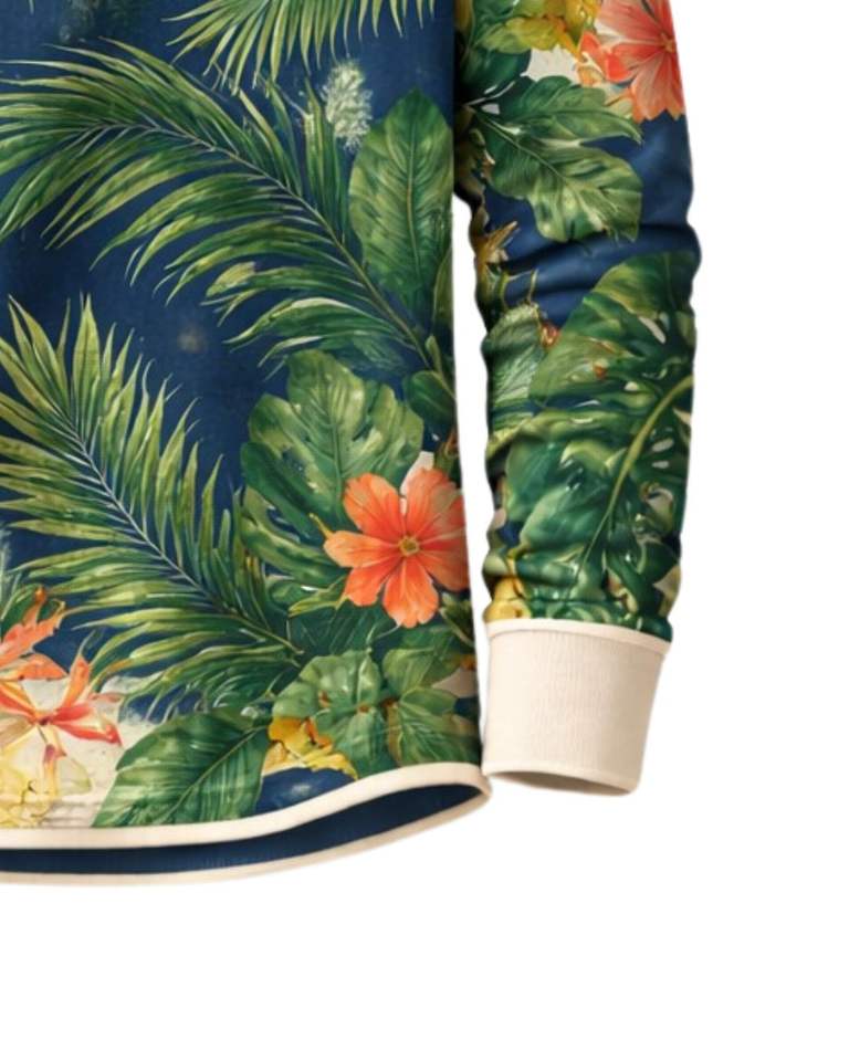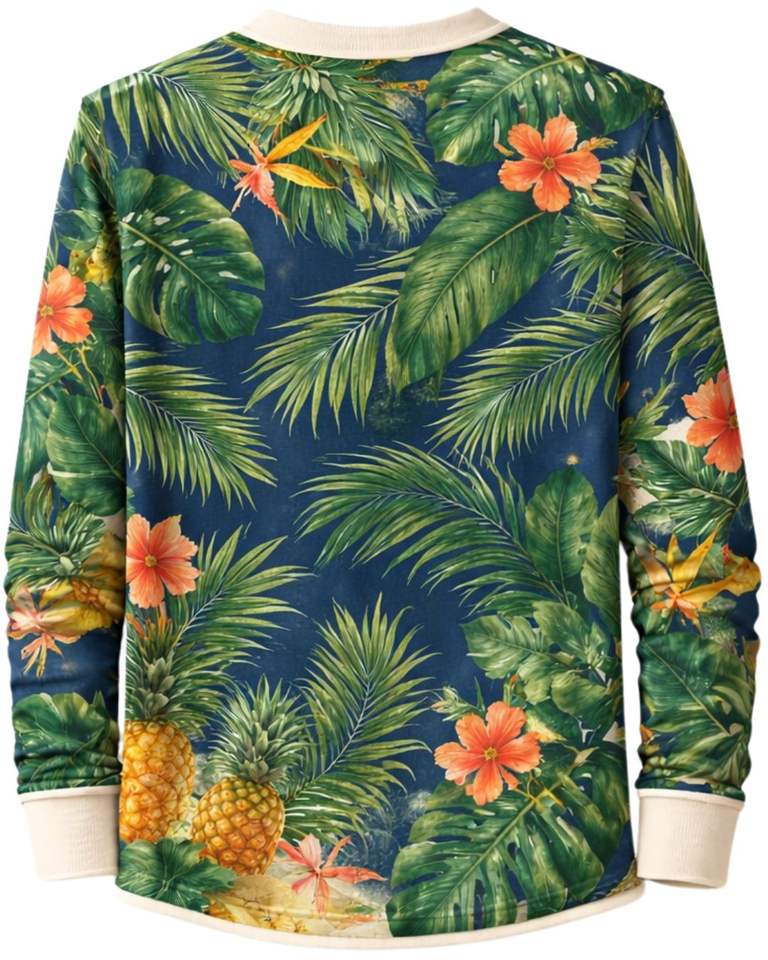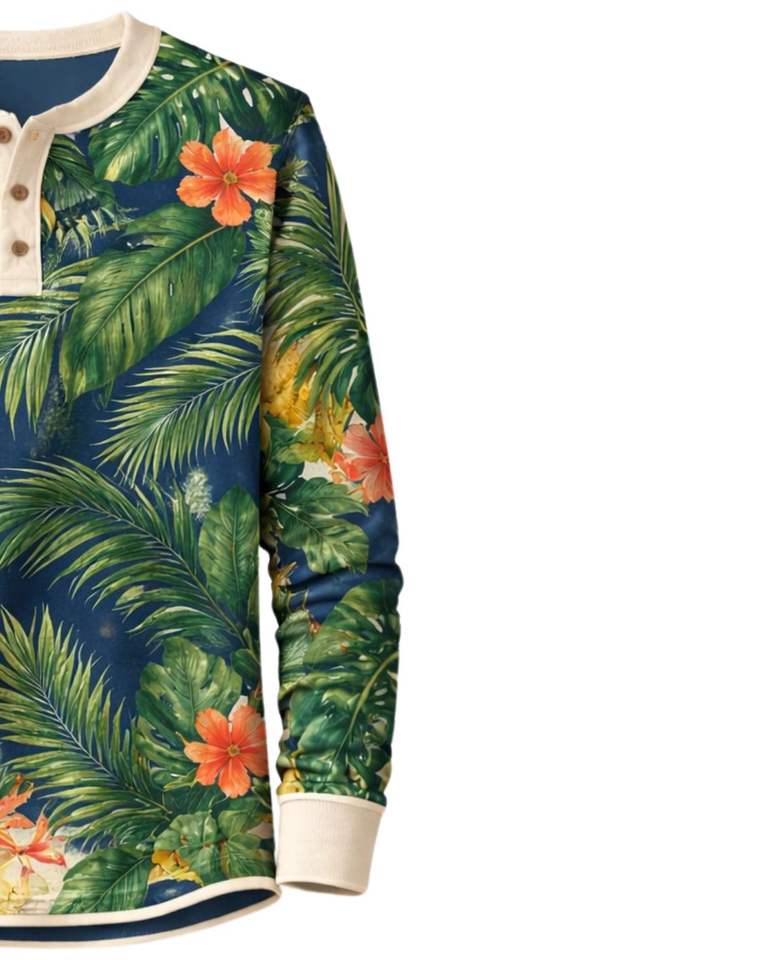 เสื้อเชิ้ตเฮนลีย์ลายดอกไม้เขตร้อนสำหรับผู้ชาย สีน้ำเงินกรมท่าและสีเขียว แขนยาว ติดกระดุม แนวลำลอง สไตล์ชายหาด สำหรับฤดูร้อน แฟชั่นเสื้อท่อนบน