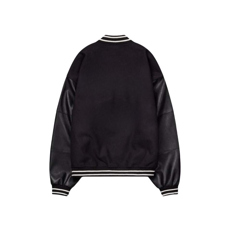แจ็กเก็ตบอมเบอร์ทีมตัวแทนของผู้ชายเสื้อนอกสีดำโอเวอร์ไซส์ทรงพอดีตัวแต่งขอบด้วยหนังเทียมแขนเสื้อและปักโลโก้ด้านหลัง
