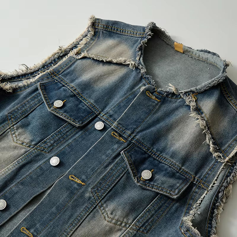 เสื้อกั๊กยีนส์สไตล์วินเทจสำหรับผู้ชาย แจ็คเก็ตแขนกุด ระบายอากาศได้ดี แต่งกระดุม มีกระเป๋าขนาดใหญ่ ซิป ผ้าฝ้าย เสื้อนอกลำลอง สไตล์ไบค์เกอร์