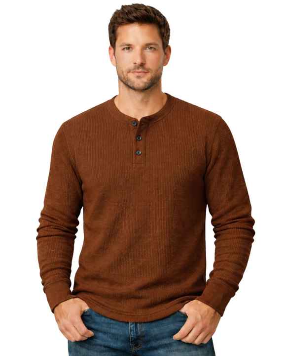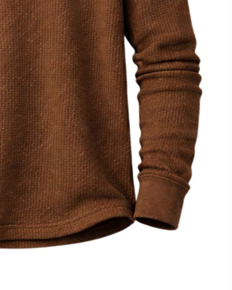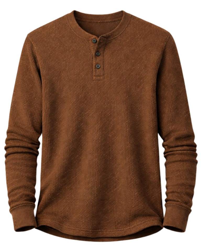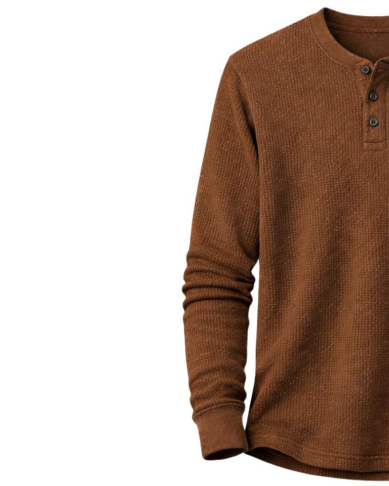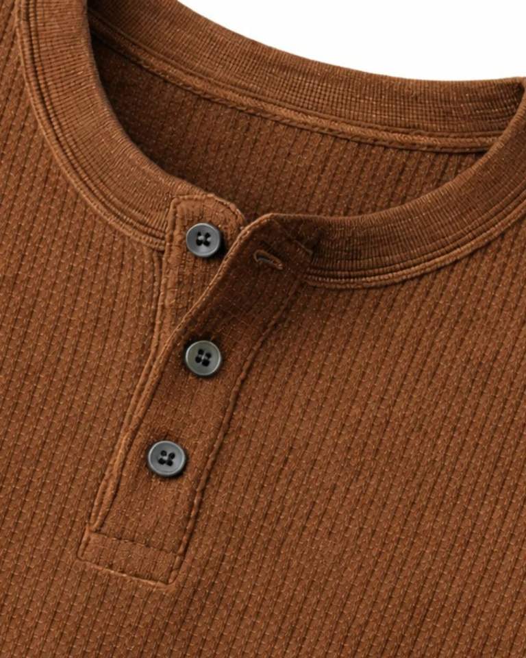 เสื้อยืดแขนยาวผู้ชายแบบเฮนลีย์ ผ้าวาฟเฟิล สีน้ำตาล สวมใส่สบาย คอติดกระดุม เหมาะสำหรับฤดูหนาว ผ้าฝ้ายทรงเข้ารูป ระบายอากาศได้ดี
