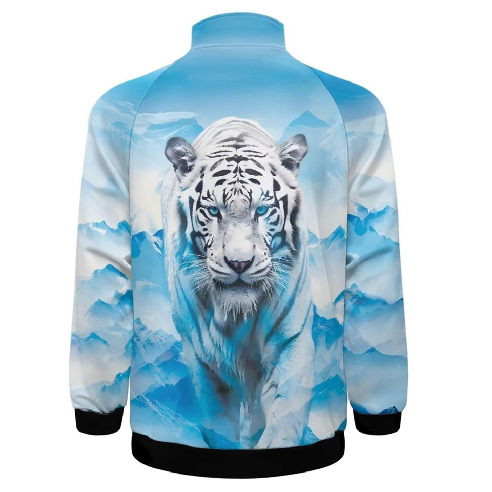 เสื้อแจ็คเก็ตบอมเบอร์พิมพ์ลายเสือสีขาวสำหรับผู้ชายเสื้อแจ็คเก็ตแบบมีซิปรูดสีน้ำเงินพิมพ์ลายกราฟิกภูเขาหิมะเสื้อโค้ทพิมพ์ลายสัตว์ไม่เหมือนใครชุดกีฬาลำลอง