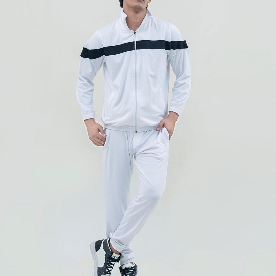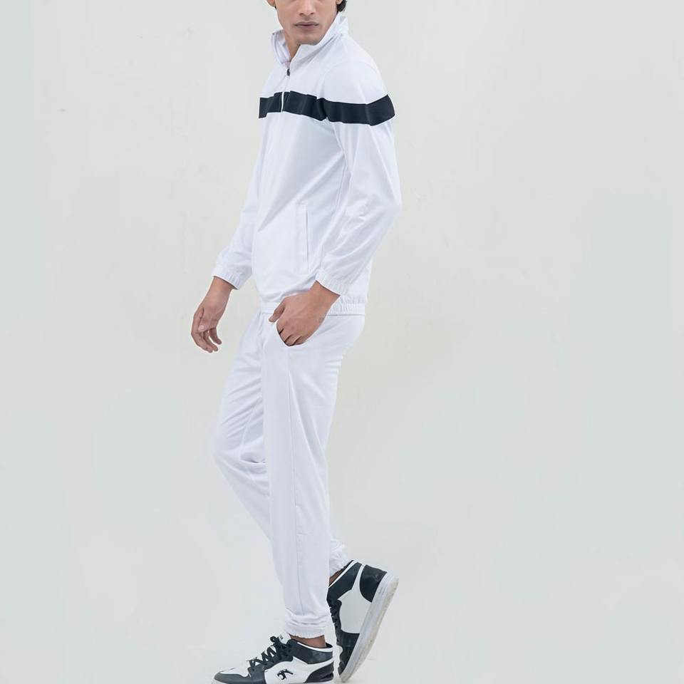 ชุดวอร์มผู้ชายสีขาวแบบมีซิปเต็มตัว คอตั้ง ชุดกีฬา แต่งแถบสีดำที่หน้าอก เหมาะสำหรับวิ่งจ๊อกกิ้ง ออกกำลังกาย ผลิตจากผ้าโพลี