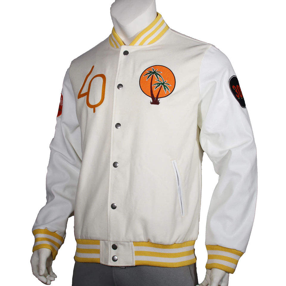 เสื้อแจ็คเก็ตวาร์ซิตี้สีขาวและเหลืองสำหรับผู้ชาย ปักลายต้นปาล์ม สไตล์ลำลอง บอมเบอร์โค้ท แฟชั่นสตรีทแวร์ เสื้อคลุม