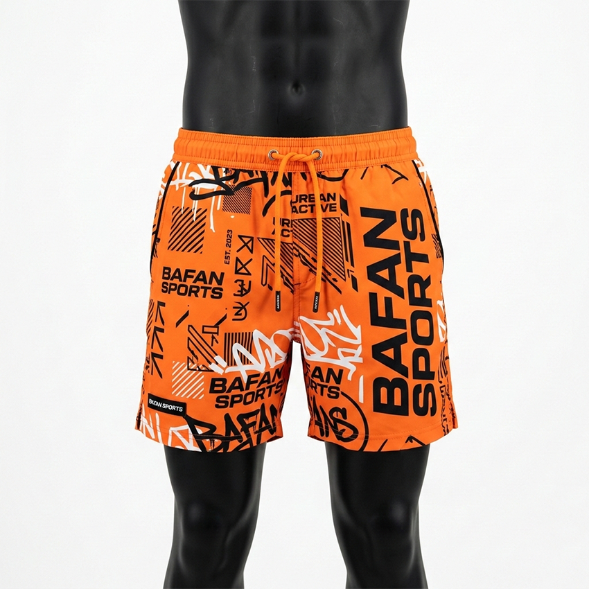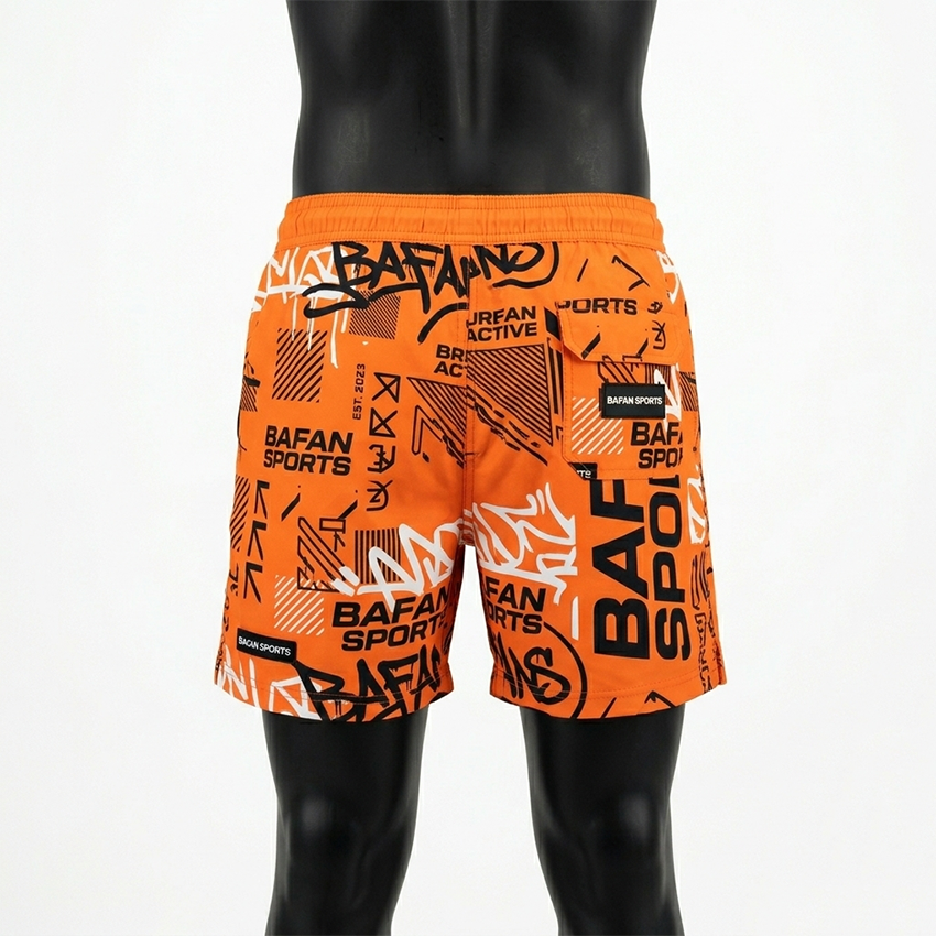 กางเกงว่ายน้ำผู้ชายพรีเมียม 130 GSM แห้งเร็ว ผลิตจากโพลีเอสเตอร์ สีส้มสดใส พิมพ์ลายแบบ Sublimation ทั้งตัว พร้อมโลโก้สั่งทำพิเศษ สำหรับใส่ไปชายหาด