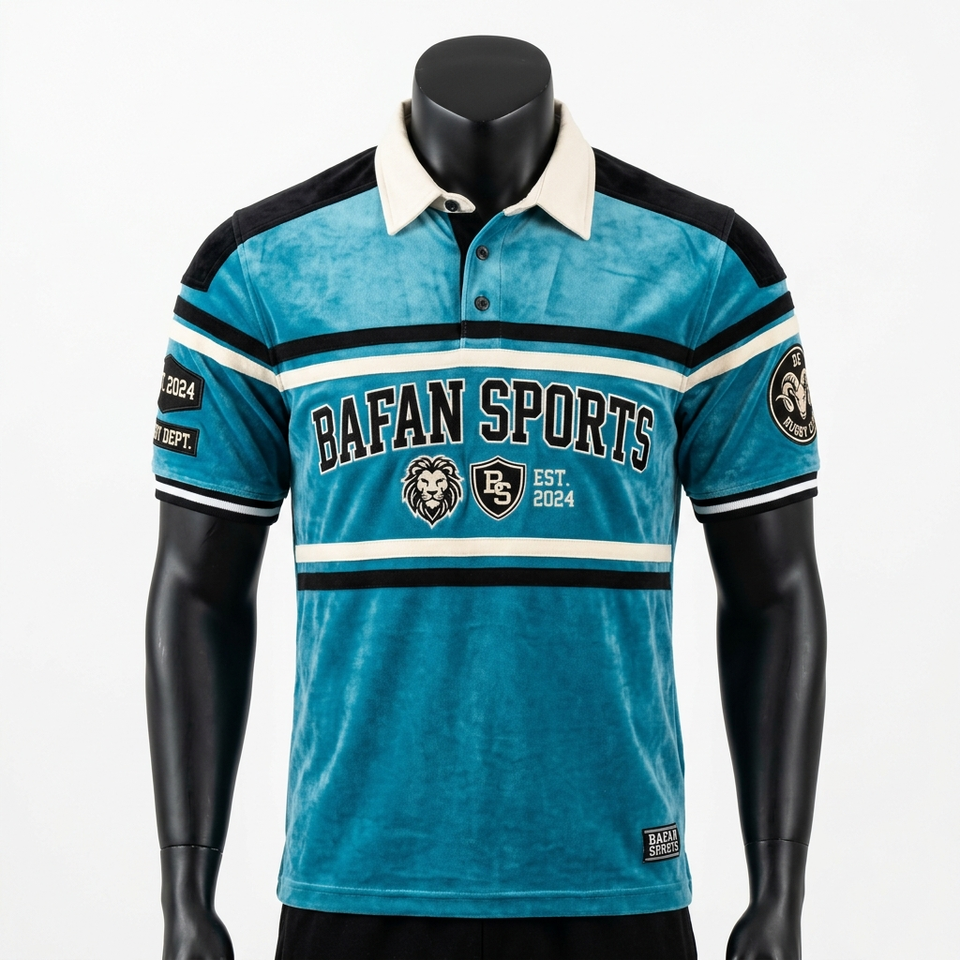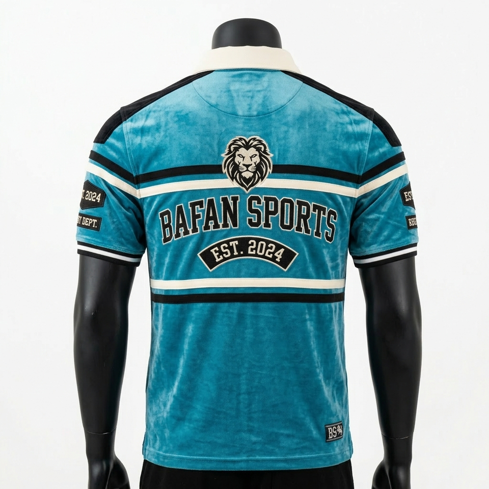 เสื้อรักบี้ชาย ผ้าถักโพลีเอสเตอร์ผสมคอตตอน ทนทาน สีเขียวอมฟ้า แถบสีดำ ลายพิมพ์ซับลิเมชั่น โลโก้สั่งทำ เสื้อโปโลรักบี้ชาย