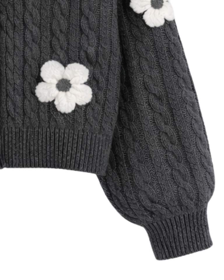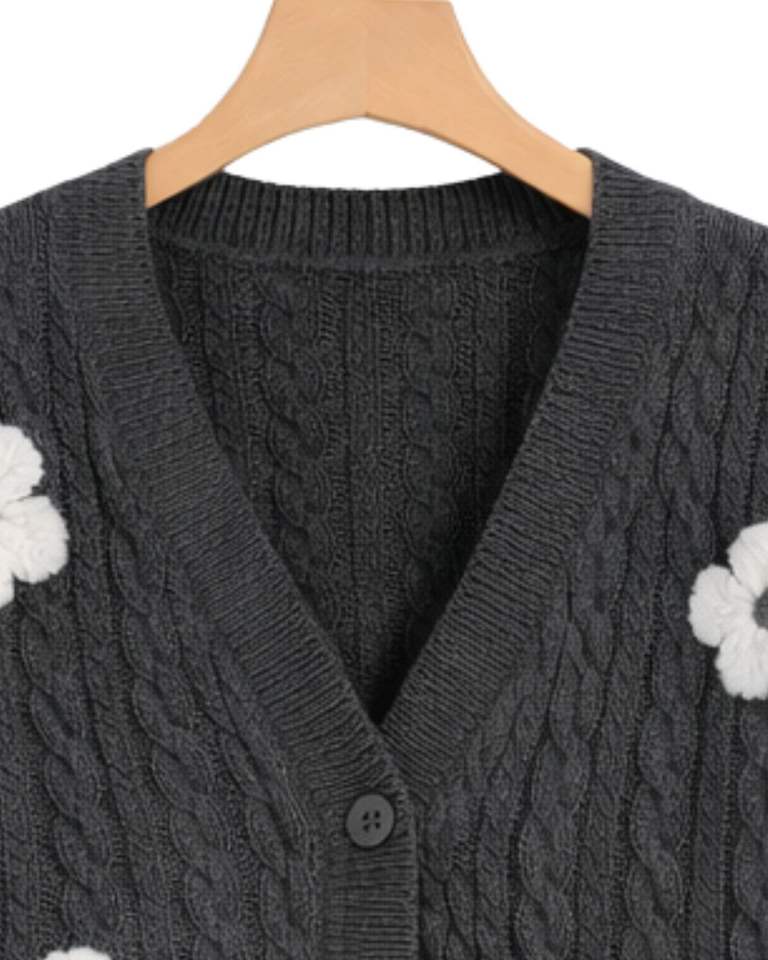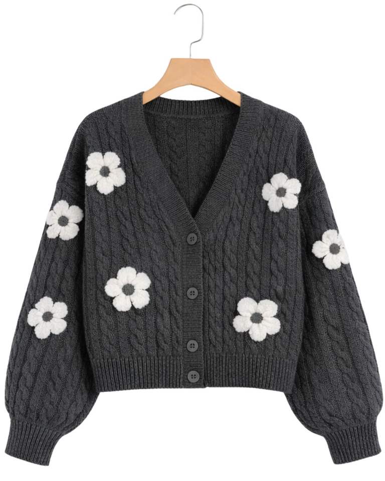เสื้อคาร์ดิแกนถักไหมพรมสีเทาเข้มสำหรับผู้หญิง ตกแต่งดอกไม้สีขาว คอวี ติดกระดุมด้านหน้า น่ารัก แฟชั่นฤดูหนาว ผลิตตามสั่ง