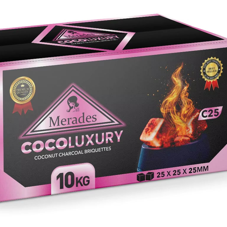 ถ่านชิชาเมราเดส โคโค่ ลักชัวรี รูปทรงหกเหลี่ยม คุณภาพสูง ติดไฟนาน ดีไซน์หรูหรา ออกแบบมาเพื่อส่งออกไปยังตุรกี